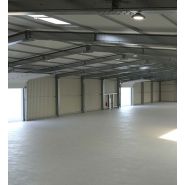 avec 1 grande porte d'accès pour chariot élévateur et 2 portes de secours, toiture double peau avec puits de lumière et trappe de désenfumage