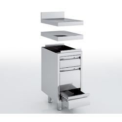 Meuble neutre avec tiroirs série 700 - Avec dosseret de 100 mm - Inox AISI - 304 18/10 satiné - Dimensions : 400 x 700 x 850 mm - Meuble comprenant 3 tiroirs, 1 prof. 100 mm, 1 prof. 200 mm et 1 prof. 100 mm - Marque : Eratos - Couleur : grey - Matière : Stainless steel 18/10 - Prix de li