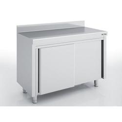 Meuble inox bas adossé avec portes coulissantes - Meuble de travail entièrement en acier inox. - Plan de travail avec dosseret de 100 mm. - Bord tombant de 40 mm et retour de 15 mm renforcé par de l'aggloméré stratifié blanc de 18 mm. - Muni de deux portes coulissantes et d'une étagère i