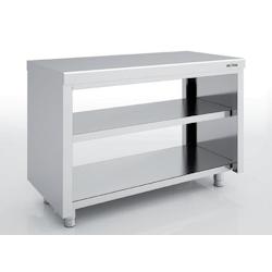 Meuble neutre ouvert série 700 - Traversant - Sans dosseret - Inox AISI - 304 18/10 satiné - Dimensions : 1800 x 700 x 850 mm - Sans portes - Dessus et étagère intérieure renforcés par omega - Etagère intérieure réglable en hauteur sur supports très résistants - Pieds robustes et