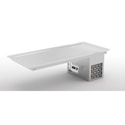 Plaque froide avec groupe incorporé à encastrer - Construction inox AISI-304 18/10 finition satinée - Température de la plaque -4°/+4°C - Froid statique grâce à un serpentin en cuivre - Isolation écologique haute densité - Plaque totalement soudée - Panneau de commande amovible avec thermostat digital et interrupteur lumineux - Dimensions encastrement : 1095 x 625 x 420 mm - Capacité : 3 GN1/1