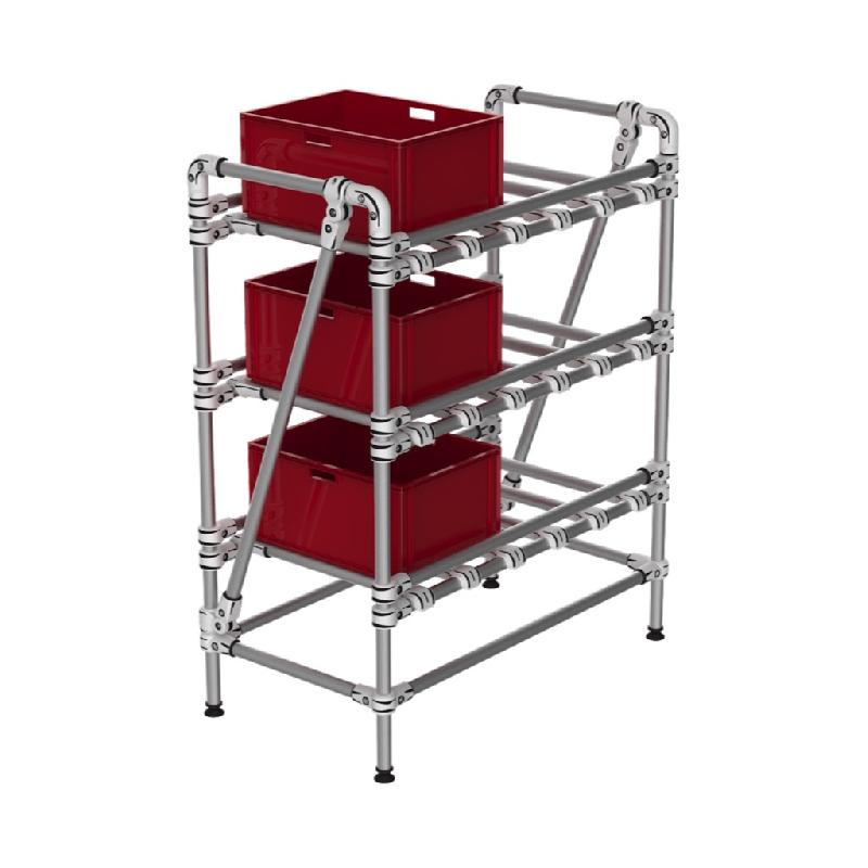 Etagère tubulaire avec butées anti-chutes avant et arrière. Entièrement modulaire ajustable et évolutive. Ideal pour cartons, boites et KLT. 3 niveaux ajutables. Structure en Aluminium anodisée robuste. Montée sur pieds réglables au sol.