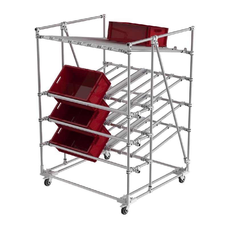 Présentoirs kitting FIFO pour KLT et boites à fond irrégulier non-glissants sur rails à galets. 3+1 niveaux. Systèmes de kitting frontaux permettant une inclinaison à 45° du contenant pour un picking ergonomique. Séparateurs central de boites créant 2 lignes de descentes. Niveau retour en partie supérieure. Modèle équipés de 4 roulettes. Surfaces tubulaires pour glissement des boites. Construction Aluminium. Niveaux réglables en hauteur. Charge 150 kg par niveau en version standard.