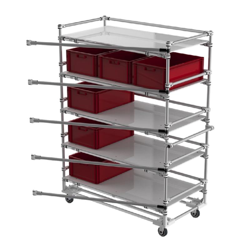 Chariot modulaire avec poignées. Structure fermée anti - chutes sur les 4 cotés. Idéal pour cartons, boites et KLT. Niveaux réglables en hauteur. Charge 150 Kg par niveau. 4 Niveaux. Monté sur embase roulette platine : 2 Roulettes pivotantes et 2 roulettes pivotantes avec frein. - Référence
