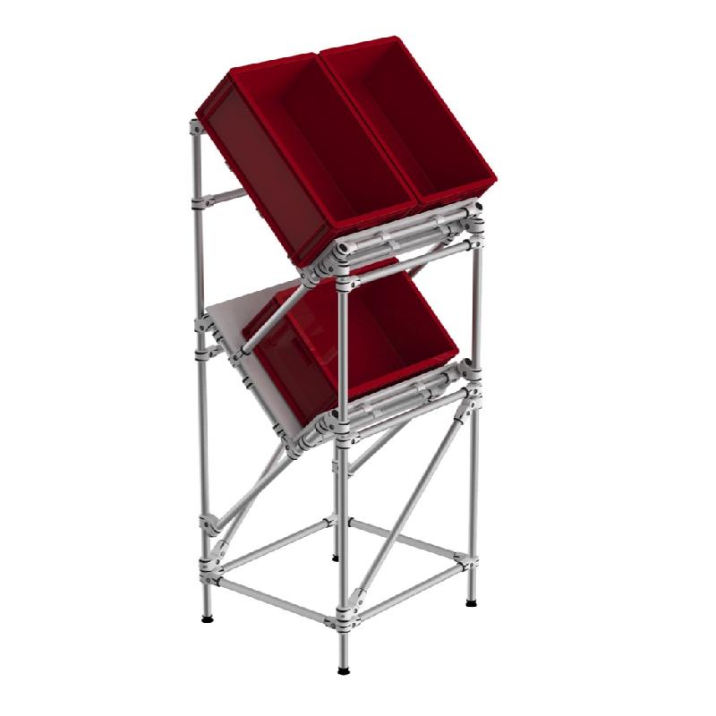 Etagère ergonomique en V pour stockage et Picking. Idéal pour boites et cartons. 2 niveau. Structure en Aluminium légère, réglable et évolutive. Montée sur pieds au sol Ajustables
