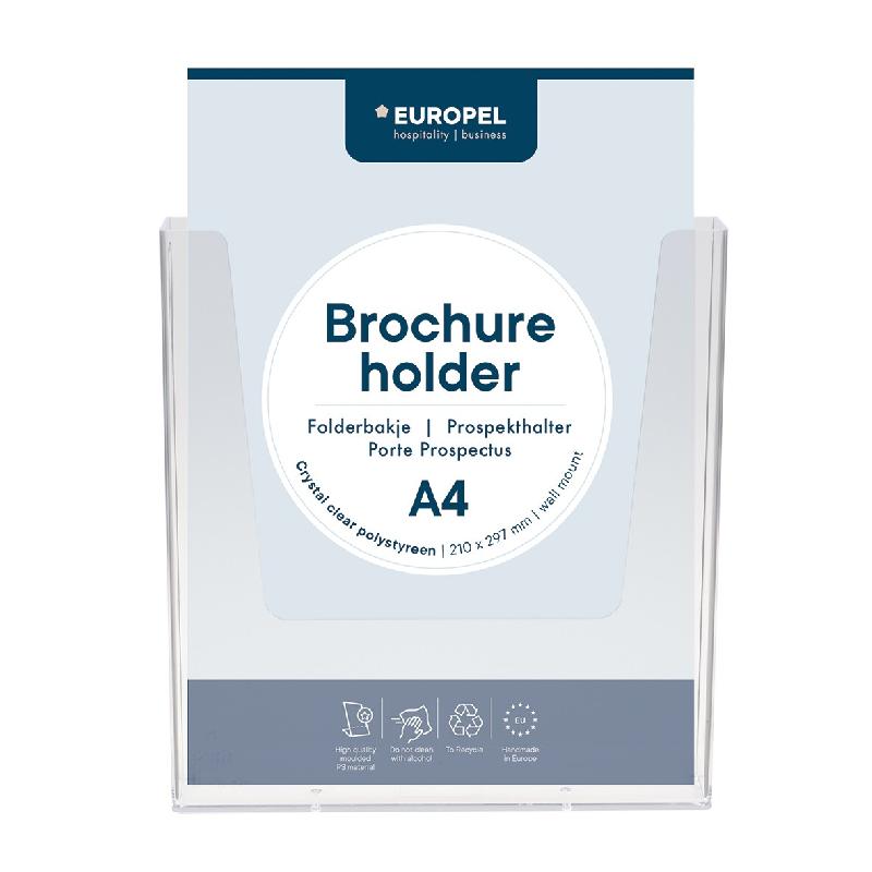Porte Prospectus ou présentoir mural EuropelA4 Porte - brochures mural pour une présentation claire des brochures, catalogues et tarifs. Plastique transparent et robuste d'une épaisseur de 2mm. Avec 2 oeillets pour les suspendre. Capacité 35mm. Format A4. - Marque : Europel - Matière : plast