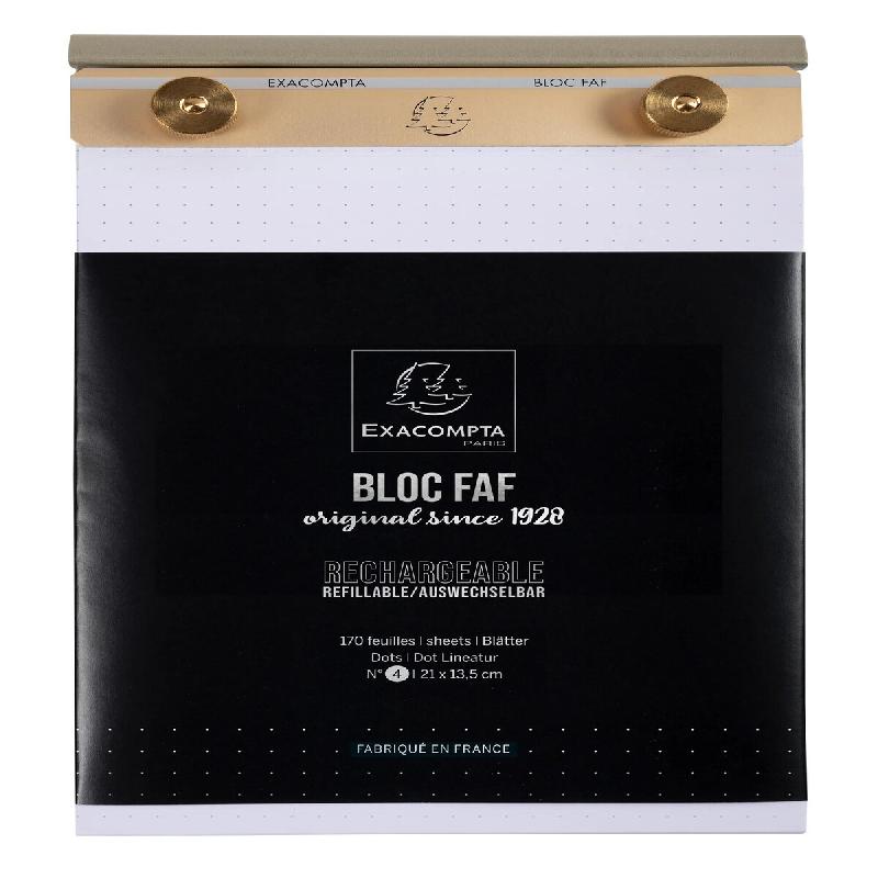 A l'heure du tout remplaçable et de l'obsolescence programmée, le produit se distingue par sa conception utile et responsable : le bloc-notes Faf est rechargeable. Il suffit de dévisser ses écrous en laiton pour retirer la barrette et de placer la recharge pour lui offrir une deuxième, troisième, quatrième vie, et ce à l'infini. Avec son design unique et résolument rétro, le bloc-notes Faf trouve sa place sur tous les bureaux par son élégance intemporelle. Idéal pour une prise de notes rapide, il reste stable sur tous les supports grâce à ses patins anti-dérapants. Il est conçu pour durer avec son support entièrement en aluminium et en laiton - Bloc papier Clairefontaine, 170 feuilles blanches microperforées en en-tête : les feuilles se détachent aisément - réglure dots. Dimensions : 22 x 13,5 cm - Format n° 4 - Adaptées aux recharges réf 12214E, 12514E, 12524E d'Exacompta. Pas de plastique, ni de conception fragile. Fabrication française - Vendu à l'unité - Livré dans un superbe coffret cadeau aussi pratique que raffiné