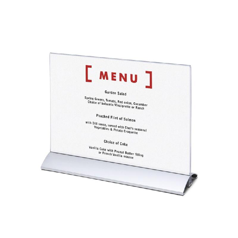 Présentez votre menu, vos prix ou vos informations grâce à ce porte-cartes. Un présentoir de table élégant, idéal pour les tables et les comptoirs. Changez le contenu rapidement et facilement en insérant votre carte dans le support en acrylique transparent. Parfait pour les salles d'attente, les réceptions, les commerces et le secteur de l'hôtellerie-restauration.