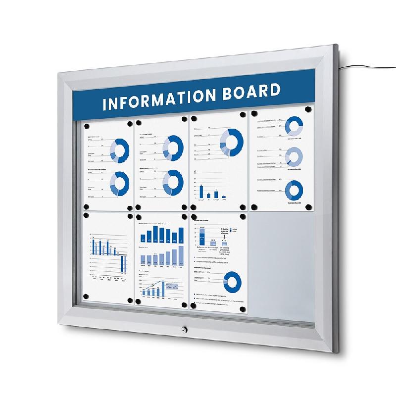 Caractéristiques principales : - Adapté à l'extérieur - Verrouillable - Parties vitrées en verre trempé - Personnalisable au marqueur - Panneau logo rétro - éclairé customisable par impression numérique - Éclairage : LED - Matière : Aluminium - Matière panneau arrière : Tableau