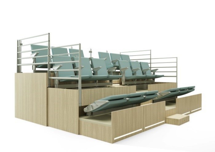 notre espaces profond est assez limité (3m), nous disposons par contre de 25m de longueur. Il nous faudrait des sièges (accueil de personnes âgées) et de la place disponible pour personnes à mobilités réduites. Des gardes corps sur la largeur, ainsi que sur l'espace haut. Merci.
