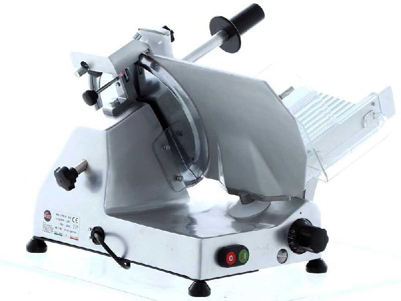 - Tension : 230 V - Puissance : 180 W - Matériau du boîtier : Aluminium anodisé poli - Matériau des poignées : Plastique très ferme - Matériau de la lame : Acier spécial pour lames - Diamètre de la lame : 250 mm - Épaisseur des tranches : 0 - 12 mm (réglable en continu) - Vitesse