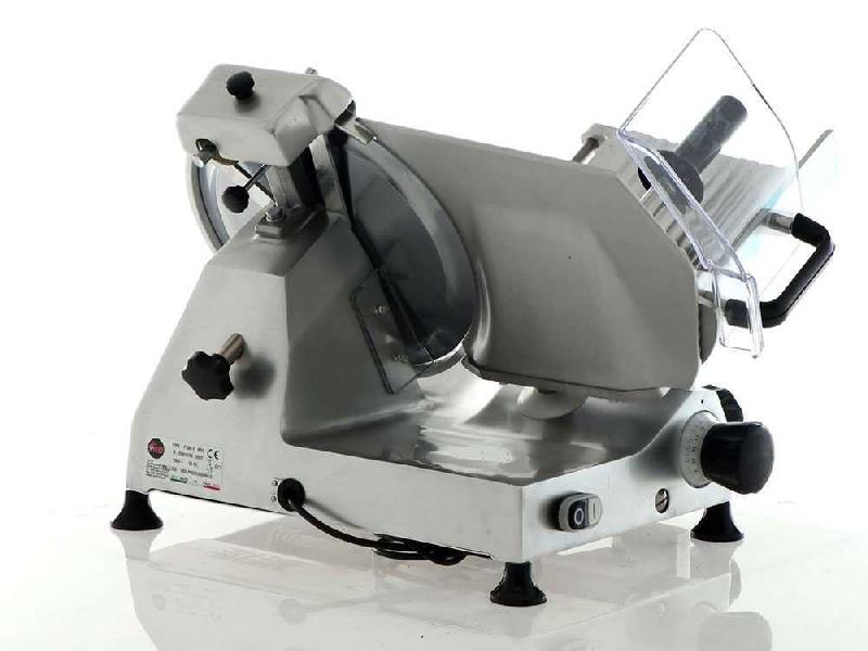 La trancheuse modèle F 300 E en alliage d'aluminium traité anodiquement présente l'avantage d'un nettoyage rapide et d'une hygiène absolue. Le régulateur d'épaisseur de coupe de 0 à 16 mm est très sensible et permet un réglage décimal. L'affûteur simplifie le travail de l'utilisateur en maintenant efficacement la coupe parfaite des marchandises. Le plateau monté sur roulements à billes présente une douceur exceptionnelle et permet de couper des charcuteries lourdes, des rôtis, des fromages, des poissons, des viandes dures et bien plus encore. CARACTÉRISTIQUES TECHNIQUES : Moteur ventilé monophasé HP 0,35 (220-240 V / 50-60 HZ) - Diamètre de la lame (mm) : 300 - Tours par minute de la lame (r.p.m.) : 300 - Épaisseur de coupe (mm) : 0-16 - Découpe utile : L x H (mm) : 220 x 220 - Accessoire taille-crayon intégré. Dimensions : Longueur maximale avec porte-produit ouvert : 650 mm - Longueur de la base support : 465 mm - Hauteur avec porte-produit ouvert : 440 mm - Largeur de la base support : 340 mm - Largeur maximale avec plaque : 495 mm - Poids : 23 kg.