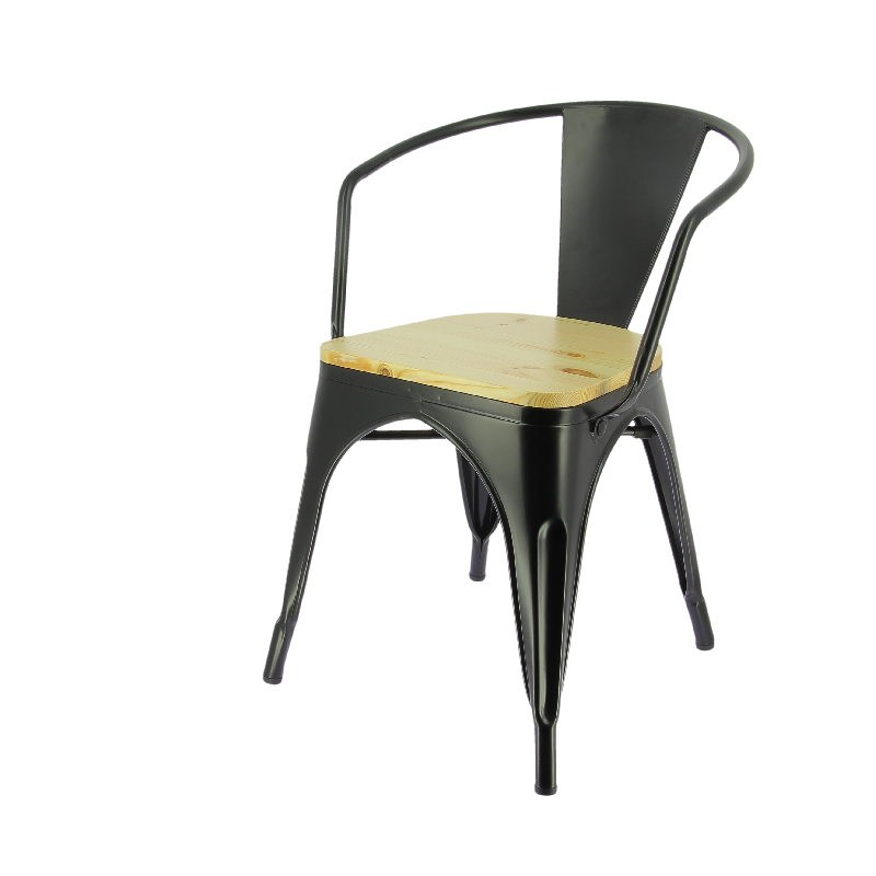 Fauteuil en métal noir avec accoudoirs, idéal pour les hôtels et restaurants cherchant à offrir un confort supérieur. Son assise en bois de pin et son style industriel sont parfaits pour un décor tendance et chaleureux