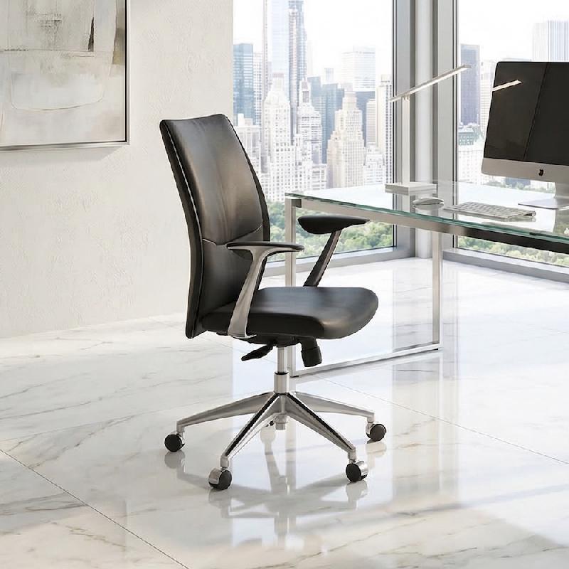 Vérin pneumatique. Cuir noir. Inclinaison synchronisée de l'assise et du dossier avec réglage de tension auto - adaptatif. Blocage 5 positions avec système anti - panique. Accoudoirs réglables en hauteur avec manchettes soft touch. Base aluminium poli. - Domaine d'utilisation : - Fauteuil de