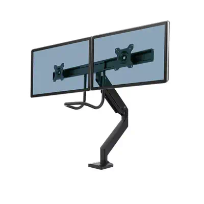 Bras porte - écran double à barre transversale Eppa - Alignement parfait des écrans grâce à la barre transversale. - Idéal pour les espaces de travail plus petits. - Poignée ergonomique pour un repositionnement facile et un travail collaboratif favorisé. - Bras pivotant à 360° avec fon