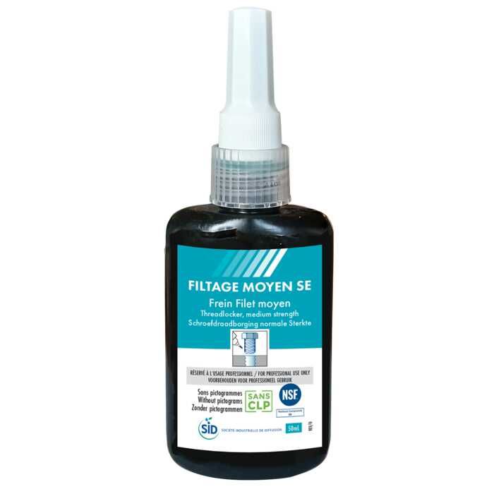 FILTAGE MOYEN SE est un adhésif anaérobie de type freinfilet de résistance moyenne, identifiable par sa couleur bleue. Il est spécifiquement formulé pour assurer le blocage, l’étanchéité et la protection des assemblages filetés métalliques. En créant une liaison polymérisée entre les parties métalliques, il prévient le desserrage provoqué par les vibrations, les chocs mécaniques ou les variations de température, tout en autorisant un démontage ultérieur à l’aide d’outils conventionnels sans détériorer le filetage.