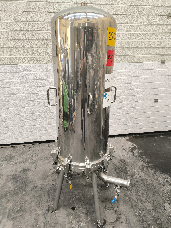 Filtre à manches en acier inoxydable 316L, avec couvercle rabattable manuellement à l'aide de pistons. Support pour placer 9 manchons, boule de nettoyage CIP. Fenêtre de visualisation. 2 regards dans la carrosserie. Chaudière avec électrovannes pour refoulement et soufflage des poches de filtra