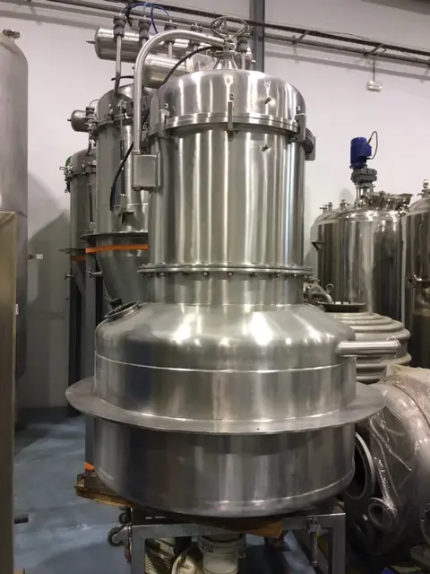 Filtre à manches en acier inoxydable 316L, avec couvercle rabattable manuellement à l'aide de pistons. Support pour placer 9 manchons, boule de nettoyage CIP. Fenêtre de visualisation. 2 regards dans la carrosserie. Chaudière avec électrovannes pour refoulement et soufflage des poches de filtration. Agitation dans le fond inférieur avec racleurs Téflon pour extraction du produit. Moteur ATEX 4 kW à 1425 tr/min réducteur à 185 tr/min. Anneau de support monté sur équipement. Tarière pour extraction de solides en acier inoxydable 316L.