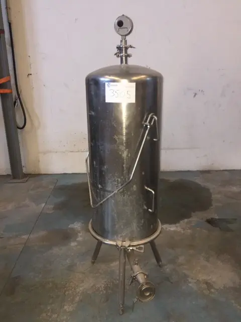 Filtre à manches en acier inoxydable 316L, avec couvercle rabattable manuellement à l'aide de pistons. Support pour placer 9 manchons, boule de nettoyage CIP. Fenêtre de visualisation. 2 regards dans la carrosserie. Chaudière avec électrovannes pour refoulement et soufflage des poches de filtra
