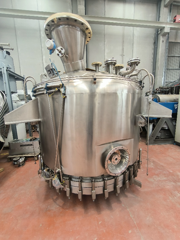 Filtre à manches en acier inoxydable 316L, avec couvercle rabattable manuellement à l'aide de pistons. Support pour placer 9 manchons, boule de nettoyage CIP. Fenêtre de visualisation. 2 regards dans la carrosserie. Chaudière avec électrovannes pour refoulement et soufflage des poches de filtra