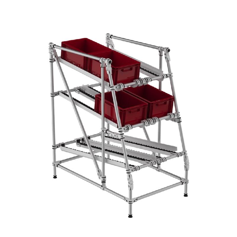 Flow Rack midsize à 2 niveaux FIFO +1 niveaux retour vides en position basse avec structure de picking frontal à angle pour optimisation ergonomique. Rails à galets rivetés robustes . Butées stop en partie avant .Structure en Aluminium . Montage sur pieds réglables