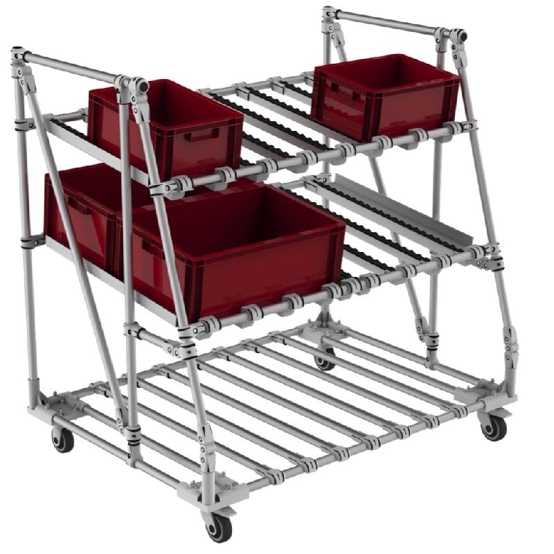 Flow Rack midsize à 2+1 niveaux avec structure de picking frontal à angle pour optimisation ergonomique. Niveau bas en mode stockage . Rails à galets rivetés robustes avec guides latéraux et centraux anti-chutes pour optimisation du flux. Butées stop en partie avant. Structure en Aluminium. Montage embase roulettes platine avec 2 roulettes pivotantes et 2 roulettes pivotantes frein.