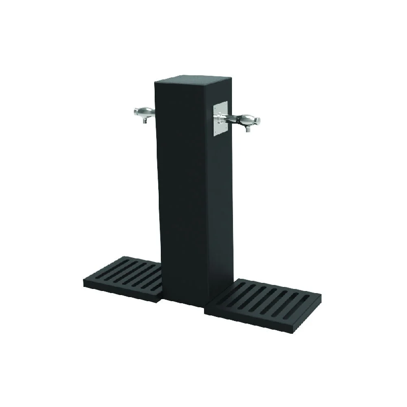 Fontaine en acier "Meaux" double - Adaptée aux personnes à mobilité réduite (PMR) - Matériaux : Acier avec finition peint noir sur couche anti - oxydante - Équipement : Robinet et bac en inox - Nombre de robinets : 2 robinets en laiton chromé à jet vertical - Fixation : Par scellement