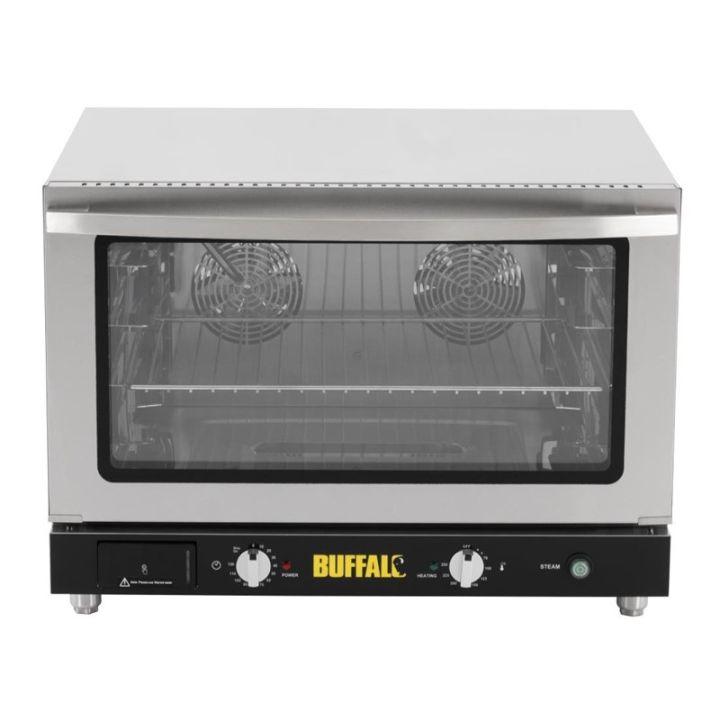 Avantages Injection d'humidité simple par bouton-poussoir - bac à eau intégré, aucun raccordement réseau Cuisson plus régulière - ventilateur de convection pour une température homogène dans la cavité Productivité - compatible 4 x 600 x 400 ou 4 x GN 1/1 Économie d'énergie - double vitrage pour limiter les déperditions Durabilité - charnières renforcées et protection contre la surchauffe Entretien facilité - conception inox et surfaces faciles à nettoyerConçu pour les ateliers de boulangerie-pâtisserie, les cuisines de restauration et les structures à débit constant, ce four à convection Buffalo combine simplicité d'utilisation et performance de cuisson. La ventilation assure une circulation d'air efficace pour des résultats uniformes sur plusieurs niveaux, même lors d'enchaînements de fournées. La fonction humidité apporte un vrai plus sur les produits sensibles au dessèchement ou nécessitant un meilleur développement. L'injection se fait par commande directe, via un système alimenté par bac à eau intégré - pratique en laboratoire ou en point de vente où l'arrivée d'eau n'est pas disponible. La porte vitrée double vitrage permet de surveiller vos cuissons tout en conservant la stabilité thermique. La robustesse est renforcée par des charnières de porte renforcées et une sécurité contre la surchauffe, pour une utilisation sereine au quotidien. Caractéristiques principales Type - four pâtissier à convection avec humidificateur Capacité - 110 L Niveaux - jusqu'à 4 plaques 600 x 400 mm ou 4 bacs GN 1/1 Humidité - injection par bouton-poussoir avec bac à eau intégré Porte - vitrée double vitrage Ventilation - ventilateur de convection pour cuisson homogène Sécurité - protection contre la surchauffe Construction - inox et verre Nettoyage - surfaces faciles à nettoyerDonnées techniques Puissance - 4,6 kW Alimentation - 400 V (triphasé) Poids - 45 kg Hauteur - 558 mm Profondeur - 686 mm Largeur - non communiquéeCertifications et garanties Garantie - 1 an pièces Pour qui Boulangeries, pâtisseries, snacking, cafés Restaurants et cuisines de production Événementiel et sites sans arrivée d'eau (humidification via bac intégré) Structures recherchant un four compact pour viennoiseries, desserts, remise en cuisson et cuissons sur plusieurs niveauxRecommandations d'utilisation Pour l'humidification, utilisez une eau propre et surveillez le niveau du bac intégré selon votre rythme de production. Préservez la stabilité de cuisson en limitant les ouvertures de porte - le double vitrage permet le contrôle visuel sans perte de chaleur. Nettoyez régulièrement la cavité et la porte pour conserver performance, hygiène et visibilité. FAQQuelle capacité réelle et quel volume utile ?La capacité indiquée pour ce modèle est 110 L. Ce four nécessite-t-il un raccordement à l'eau pour l'humidité ?Non. L'humidité fonctionne via un bac à eau intégré, donc sans raccordement au réseau. Quels formats de cuisson sont compatibles ?Il peut contenir jusqu'à 4 plaques 600 x 400 mm ou 4 bacs GN 1/1 pleine taille. La porte est-elle isolée ?La porte est en double vitrage, ce qui aide à conserver la chaleur et à améliorer l'efficacité énergétique. La cuisson est-elle uniforme sur plusieurs niveaux ?Oui, la convection est assurée par un ventilateur conçu pour maintenir une température homogène dans la cavité. Quelles sécurités sont intégrées ?Le four dispose d'une protection contre la surchauffe. Quelle alimentation prévoir ?Alimentation 400 V triphasé, puissance 4,6 kW. Prévoyez une installation adaptée côté tableau électrique. Vous souhaitez confirmer la compatibilité avec vos plaques, vos usages (viennoiseries, pâtisserie, remise en température) et votre installation 400 V ? Demandez votre devis et vos conseils de dimensionnement.