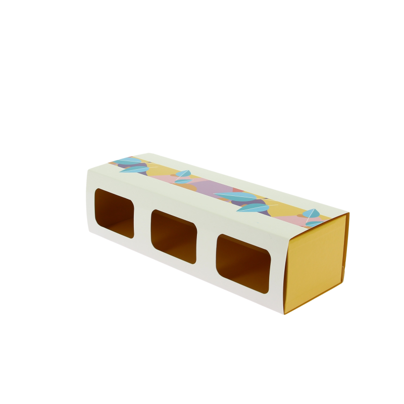 Ce modèle est spécifiquement conçu pour l'alignement de trois contenants (type bocaux de 180grs). Les trois ouvertures découpées mettent en valeur l'étiquetage et la couleur des produits. Il s'impose pour la présentation de gammes thématiques : trio de miels, assortiment de pestos, ou collection de crèmes apéritives... Il garantit une présentation soignée et ordonnée.