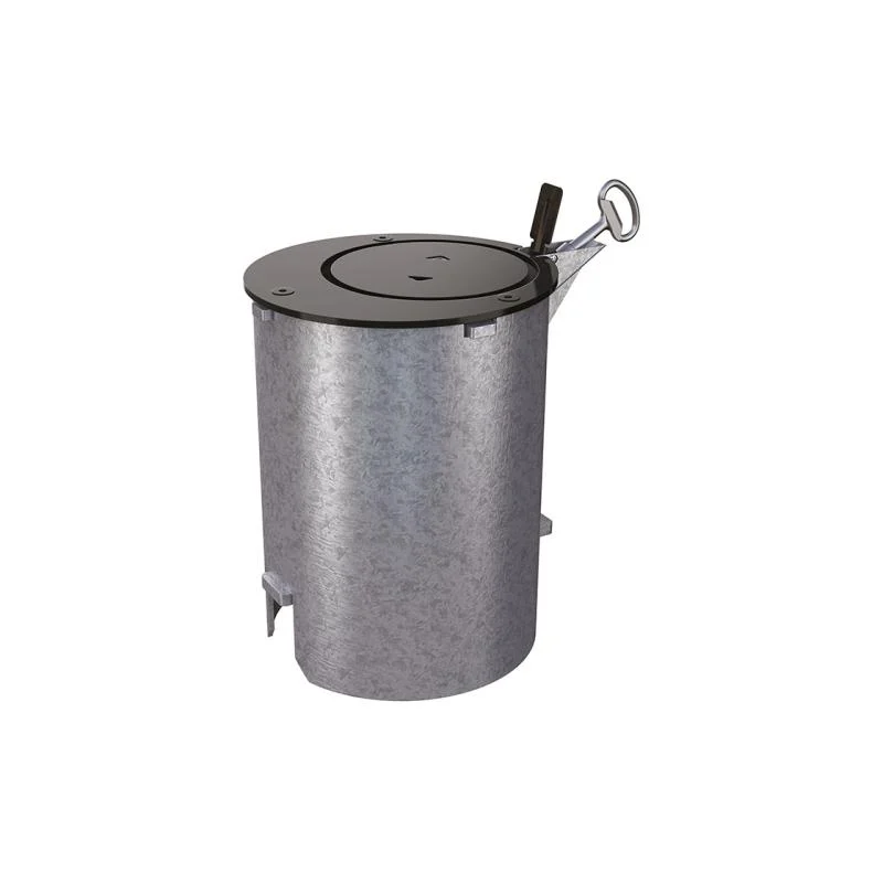 Fourreau d'amovibilité verrouillable - Caractéristiques principales : - Auto - drainant : se pose à fond de fouilles. - Effet scellement : le potelet est parfaitement stable lorsqu'il est en place. - Réserve : autorise l'accumulation des sables et des poussières. - Finition : acier galvani