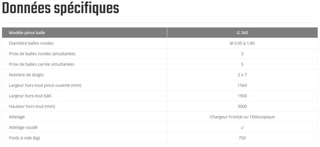 Informations générales  PINCEBAL C220 :  - Pour balles carrées de dimensions : 0,80m  - 2,20 m  - Pinces tubulaires lisses  Ø 50 mm pour ne pas abîmer les balles  - Bras souples et mobiles pour une prise de balle facilité  - Flexibles et raccords hydrauliques  - Capacité maximum de 1200 kg  -