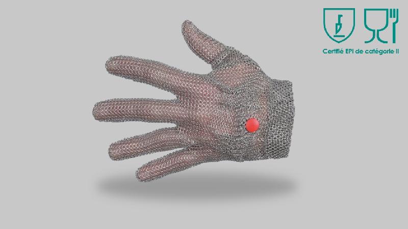 Gant-Cotte de mailleSystème fixe-gants intégréRessorts protégés dans un ourlet Fabriqué en FranceEPI catégorie III Conforme :Règlement (UE) EPI 2016/425NF EN 1082-1, ISO 13999-1, NF EN 14328 Matière :Fil et ressort : acier inoxydableConforme à la norme NF A-36-711, NF EN 1811 +A1 Conçu pour :- les industries de la viande lors d'opérations de désossage ou de découpe de la viande,- les établissements de restaurations lors d'opération de découpe de la viande, de poissons, d'ouverture de coquillage- l'industrie du textile, du cuir, du plastique ou du papier lors de découpes ou de manipulations coupantes- les industries du bâtiment lors de l'opération de pose de revêtements Ce gant vous offre un ajustement parfait sur toute la main grâce à son système de serrage par ressorts intégrés dans le gant. Meilleure tenue et meilleure dextérité. Plus besoin de fixe-gant en plastique. Cottes de mailles :Diamètre du fil : 0.5 mmDiamètre intérieur des anneaux : 3 mmDiamètre extérieur des anneaux : 4 mm Code couleur/taille : Noir : XXXS / 4-4.5 Marron : XXS / 5-5.5 Vert : XS / 6-6.5 Blanc : S / 7-7.5 Rouge : M / 8-8.5 Bleu : L / 9-9.5 Jaune : XL / 10 Violet : XXL / 11 Disponible pour droitiers ou pour gauchers Condition de nettoyage :Nettoyage à 63°C maximale avec un pistolet adapté, par trempage, par brossage énergique ou en machine à laverDésinfection à l'eau claire de 82°C minimum à 90°c maximum , en machine, par trempage ou par aspersionSéchage forcé par ventilation d'air chaud ou naturel mais dans un endroit sec et bien aéré/ventiléStockage dans un endroit frais et sec Vendu à l'unitéVoir fiche technique SVP Délai : 20/30 jours