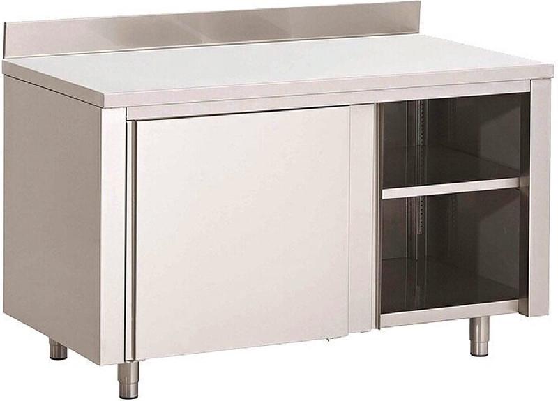Armoire de travail en inox avec portes coulissantes et rebord, 1200(L)x700(P)x880(H)mmModèle : Avec rebordExécution : Plan de travail renforcé avec un panneau de particules mélaminé résistant à l'eau de 18 mmMatériau : Acier inox soudé AISI 430Pieds ronds réglables en hauteur (50 mm) - Ma