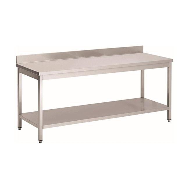Table de travail en inox avec fond de base et rebord, 1700(L)x600(P)x880(H)mm.Modèle : Avec fond de base et rebordExécution : Plan de travail renforcé par un panneau d'aggloméré mélaminé résistant à l'eau de 18 mmMatériau : Acier inox soudé AISI 430Pieds carrés (40x40 mm) réglables en h
