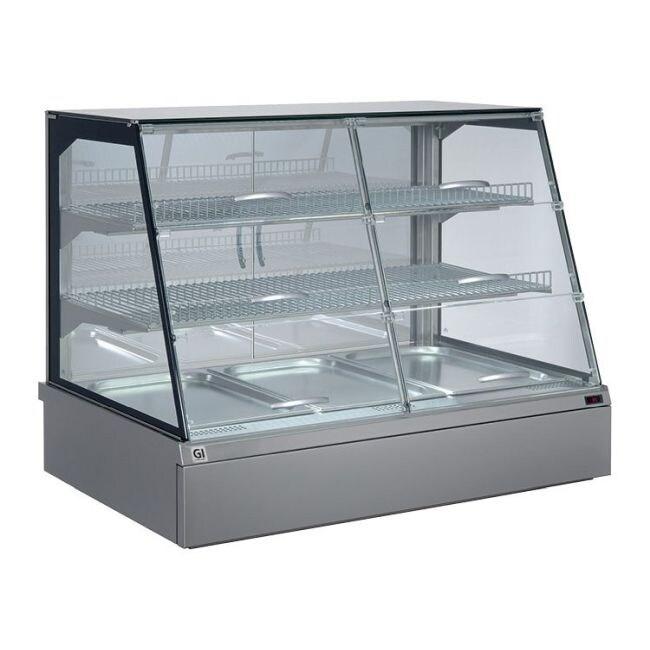Vitrine chaude fermée avec : - Vitre bombée basculante - Éclairage halogène intégré - Plan de présentation incliné à 5° - Profondeur utile : 700 mm - Caractéristiques : - Régulation électronique de la température - Remplissage en eau automatique - Hygrométrie contrôlée - So
