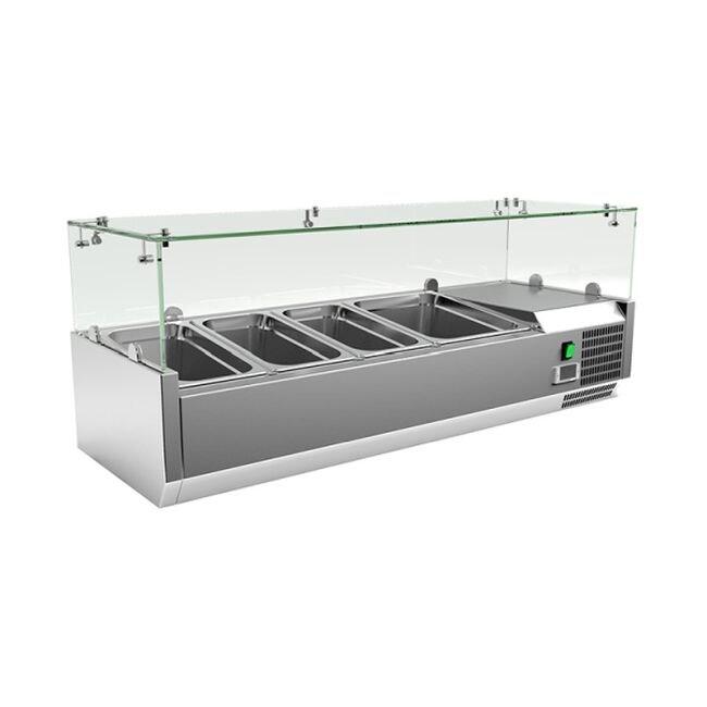 GI Inox Vitrine réfrigérée à poser 3x GN1/3 + 1x GN 1/2Réfrigération statiqueMatériau intérieur : Acier inoxydableMatériau extérieur : Acier inoxydableNombre de portes : Eclairage intérieur : Fonction de dégivrage : ManuelClasse climatique : 4Classe énergétique : CE Consommation d'énergie : Plage de température : de 2°C à 8°CTempérature ambiante maximale : 30°CRéfrigérant : R290Epaisseur d'isolation : 35mmDimensions : 1200(L)x395(P)x440(H)mmPoids : 46kgAlimentation : 230V/125WExtra : La hauteur maximale des récipients GN est de 150 mm