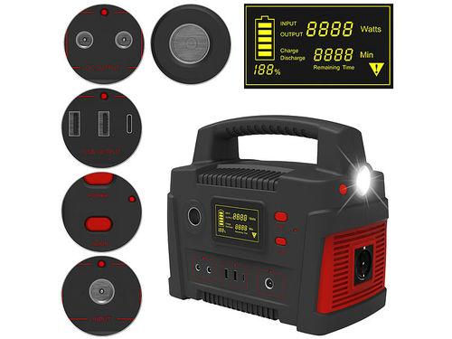Générateur / Batterie nomade. Source d'alimentation mobile autonome. Puissance max. : 600W. Capacité de la batterie : 420Wh. Branchements : 1 prise secteur 230V, 2 prises USB-A 5V/2A, 1 prise USB-C 5V/2A, 1 prise allume-cigare 14V/10A, 2 prises "jack" 14V/10A . Batterie interne rechargeable par secteur, prise allume-cigare ou panneau solaire (non fourni). Protection : Court-circuit, surtension, surcharge, sous-tension. Lampe LED 95 Lumen intégrée, avec fonction SOS. Poids : 4kg.
