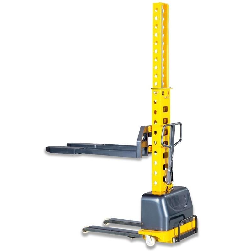 Gerbeur semi - électrique TOR DYC1035 : 1T/3.5M fait partie d'une série de gerbeurs avec élévation électrique et déplacement manuel, offrant une hauteur de levage jusqu'à 3,5 mètres pour des charges de 1 à 2 tonnes. Cette version soulève une charge pesant jusqu'à 1 tonne, à une hauteur d