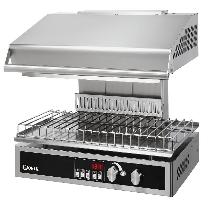 Salamandre à plafond mobile GIORIK 2 foyers. - 4 foyers radiants logés dans un plafond spécial réfléchissant, en céramique et protégés par un verre haute température diffuseur. - Plafond coulissant verticalement de 190 à 90 mm au - dessus des aliments. - Température maximum de cuisson