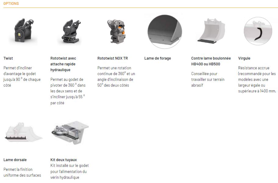 De plus, 5 versions de godets de curage inclinables peuvent vous être proposées :