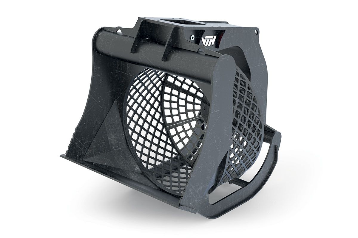 Godet cribleur rotatif à fonctionnement hydraulique, à adapter sur pelle et autres engins de 1 à 50 tonnes. Idéal pour la revalorisation des déchets de chantiers, que ce soit de la terre ou autre matière inerte. - COMPATIBILITÉ MACHINE - Chargeuse - Pelle & mini - pelle - USAGE - Cri