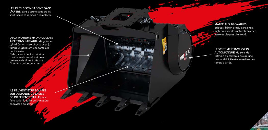 Matériaux broyables : béton armé, briques, parpaings, matériaux inertes naturels, faïence, verre, plaques d'enrobé.