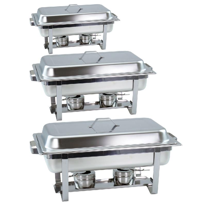 3 pièces Chafing Dish avec récipient GN 1/1 de 65 mm de profondeur Chauffe - plats empilable avec poignée arrondie - Que ce soit pour un service traiteur ou une fête privée : - présentation élégante et réchauffage et maintien au chaud pratiques de vos plats. - 3 réchauds avec 1 bac GN 1