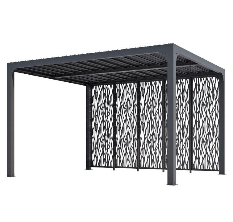 Pergola bioclimatique Habrita PER36M30BI en aluminium avec 5 panneaux moucharabieh. Décorer l'espace familial de sa terrasse, isoler un coin de détente au c?ur de son jardin ou ombrer le plancher périphérique de sa piscine, tout en seprotégeant du vent et des regards indiscrets, se réduit souvent à l'accumulation de toiles indépendantes, de parasols ou à la mise en place d'une glorietteéquipée de rideaux sombres et peu décoratifs.Depuis plusieurs années, FORESTA investit dans la performance de ses produits dans l'objectif premier de répondre aux besoins de ses clients, plusnombreux chaque année. Succès 2018, la pergola bioclimatique HABRITA PER36M30BI, bijou technologique composé de 78 lames brise-soleil orientables, 100% en aluminium thermolaqué, offrant une possibilité d'ouverture et de fermeture à 90 ° en un seul geste, alternant le soleil et l'ombre aux saisons chaudes etoffrant de se protéger des caprices climatiques, le reste de l'année. En 2019, la pergola bioclimatique se pare de nouveaux attributs pour vous apporter intimité, protection aux vents et auxregards tout en conférant à l'ensembleun aspect design et toujours élégant : 5 panneaux brise-vuesen moucharabieh. Simples à installer sur l'un des 2 côtés de 3.6 mètres de la pergolabioclimatique PER36M30BI, ces 5 panneaux, véritables écrans en acier époxy, attribent un coin d'ombrage, qui diminue les effets d'un soleil tonique, etdomptent au moyen des élégantes volutes ajourées qui les composent, tout vent en douce ventilation. Indépendants, ils permettent un grand panneau de mise en place réalisable au gré de vos désirs. Chaque panneau brise-vue est composé d'une surface plane ajourée de formes végétales oblongues, design et contemporaines, serties sur un cadre de 2,50m, rigidifiant l'ensemble. On joint ces panneaux sur les montants latéraux et supérieurs de la pergola, tout en unissantceux-ci entre eux par 4 poteauxcentraux, consacrés aux montants supérieurs de la pergola et au sol, pour assurer un contrôle constant de l'ensemble. Composé d'un acier de 1 mm, connu pour sa tenue à la pression, chaque panneau et poteau est thermolaqué en vue de réduire l'altération du temps et desintempéries. Autoportante, simple à mettre en place, installation de la pergola bioclimatique PER36M30BI avec ses 5 panneaux brise-vues créera un magnifique salond'été au c?ur de votre jardin, un espace personnalisé et tranquille pour réunir la famille au sein