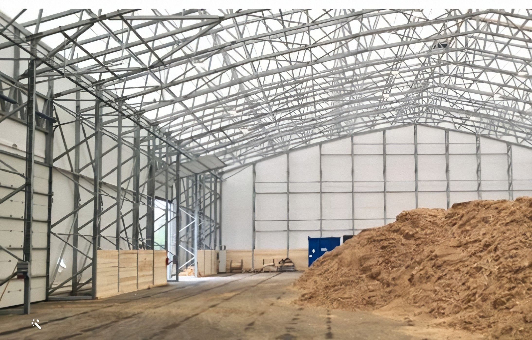 Hangar de stockage vrac - Granulés, plaquettes, céréales, matériaux - Structure démontable ou semi-permanente, montage rapide, résistance élevée