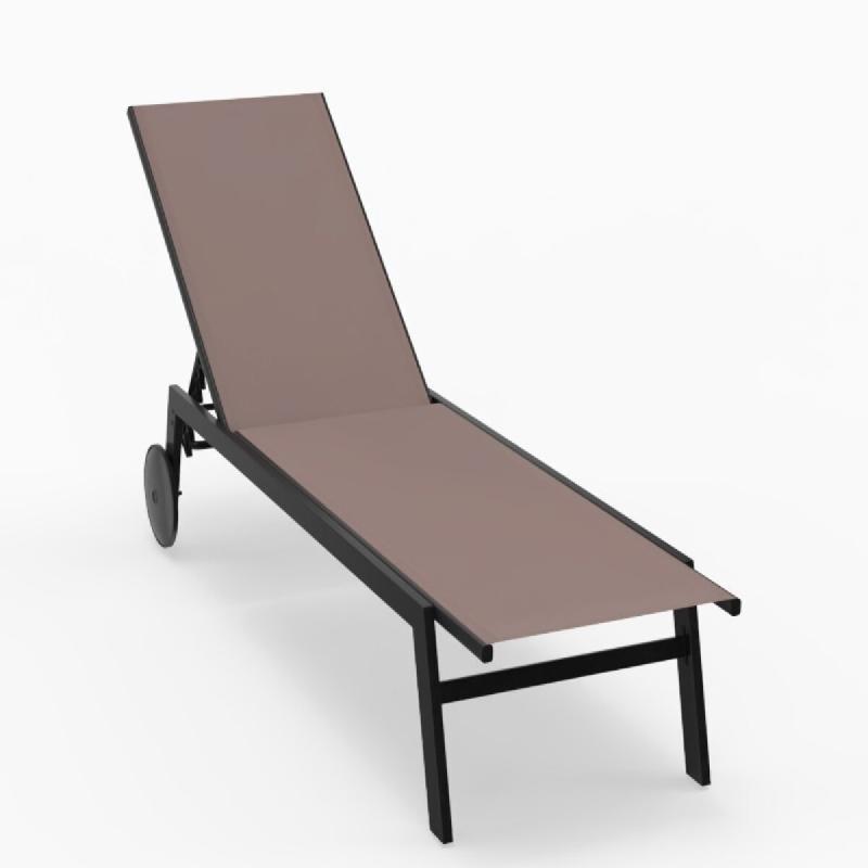 Bain de soleil Pacific noir avec 5 inclinaisons et toile Ferrari. Dimensions 193x68x35 cm, 16.5 kg. Livré sur palette. - Ce bain de soleil est fabriqué en résine renforcée de fibre de verre pour la structure et en textilène pour la toile. Il dispose de deux roues pour être transporté facilem