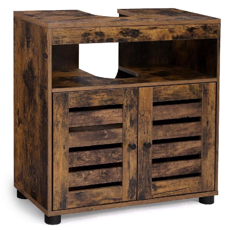 Apportez une touche de charme rustique à votre salle de bain avec ce meuble au style brun chaleureux et intemporel. Son design revisité allie caractère et fonctionnalité pour créer un espace unique et accueillant.Conçu en bois d'ingénierie de classe E1 de haute qualité, il est solide et durable. Les pieds réglables assurent une bonne stabilité, même sur un sol légèrement irrégulier, et le dispositif anti-basculement renforce la sécurité au quotidien.Ce meuble sous lavabo de 60 x 30 x 63 cm exploite intelligemment l'espace inutilisé grâce à une ouverture de siphon de 20 x 15 cm. À l'intérieur, une tablette réglable sur 3 niveaux vous permet de ranger et dissimuler vos produits d'hygiène. En façade, un casier ouvert offre un accès rapide à vos accessoires et permet de mettre en valeur vos parfums ou objets décoratifs.Le montage est simple et accessible à tous. Les pièces numérotées et les instructions illustrées facilitent l'assemblage pour que votre salle de bain gagne en organisation sans effort.Caractéristiques :