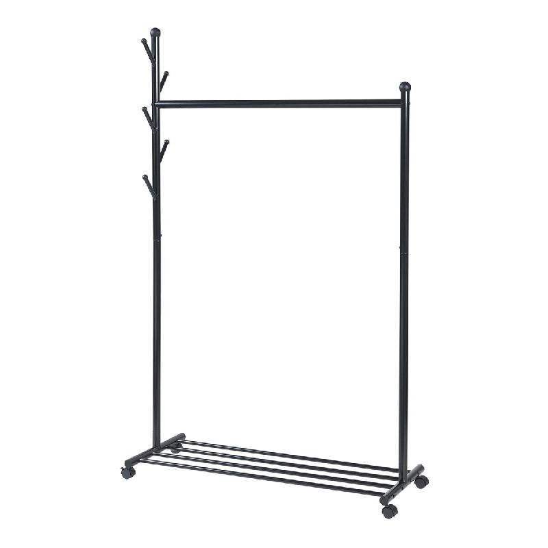 Portant à vêtementsCe portemanteau pratique sur roulettes s'assemble rapidement et facilement et offre une solution de rangement polyvalente. Il est équipé d'une barre de penderie, de 5 crochets et d'une étagère inférieure.La barre offre amplement d'espace pour suspendre vestes, manteaux, écharpes et autres vêtements, tandis que l'étagère inférieure fourni un rangement supplémentaire pour chaussures, sacs et accessoires divers.Les 4 roulettes permettent de déplacer le portant avec flexibilité d'une pièce à l'autre, tout en conservant une excellente stabilité. Cette mobilité pratique facilite le transport sans compromis sur la solidité.Organisez efficacement votre chambre, entrée ou dressing avec ce portant à vêtements mobile et multifonctionnel.Points forts :- portemanteau avec une barre de penderie et 5 crochets