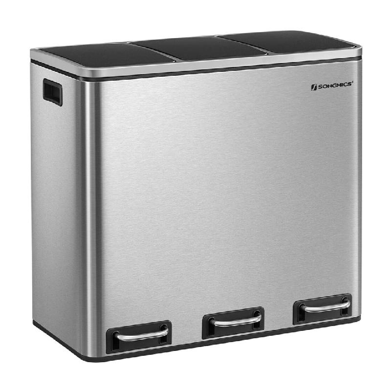 À la fois esthétique et fonctionnelle, cette poubelle à pédale avec 3 seaux intérieurs facilite le tri sélectif au quotidien. L'ouverture à pédale se révèle très pratique lorsque vous avez les mains occupées et permet une utilisation plus hygiénique.Son couvercle est équipé d'un mécanisme de fermeture amortie qui se referme lentement et silencieusement, tout en retenant les odeurs et les bactéries à l'intérieur. Son extérieur en inox bénéficie d'un revêtement résistant aux empreintes digitales : la surface reste propre et brillante, apportant une touche élégante à votre cuisine.Compacte et pratique, cette poubelle rectangulaire se place facilement contre un mur sans l'abîmer, même lorsque le couvercle est ouvert. Ses 3 seaux amovibles, munis chacun d'une poignée, se retirent aisément pour être vidés et nettoyés.Elle contribue également à la sécurité de votre foyer : seuls les appuis sur les pédales permettent de l'ouvrir, évitant ainsi que les enfants ou les animaux ne renversent les déchets.Caractéristiques :