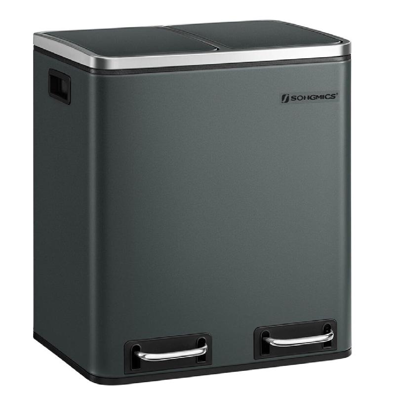 Idéale pour les petites cuisines, studios ou appartements, cette poubelle de tri sélectif compacte de 2 x 15 L vous permet de séparer vos déchets tout en gagnant de la place. Avec ses dimensions réduites, elle s'intègre facilement dans les espaces restreints.Pratique, elle dispose de deux compartiments indépendants, chacun équipé d'un seau intérieur amovible, d'une pédale et d'un couvercle. Vous pouvez ainsi trier les déchets recyclables et non recyclables de manière simple et hygiénique.Son design moderne en acier résistant, avec une finition gris verdâtre, apporte une touche élégante à votre cuisine. Le matériau est antirouille, anti-traces de doigts et facile à nettoyer, ce qui garantit une utilisation durable et sans contrainte.Les pédales permettent d'ouvrir les couvercles sans effort, et leur système de fermeture douce assure un fonctionnement silencieux, sans claquement désagréable.Pratiques et bien pensées, les poignées latérales facilitent le déplacement de la poubelle lorsque vous devez nettoyer le sol ou changer son emplacement.Couleur : Gris verdâtre
